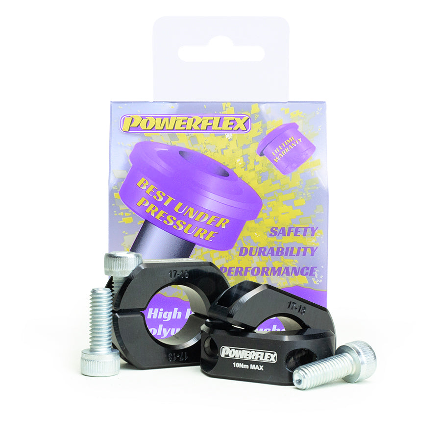 Roll Bar Support Clamps Roll Bar Lateral Support Clamps Anti-Roll Bar Lateral Support Clamps 17-18mm 17-18mm - PFC17-18 Made in precision CNC-machined 6082-T6 grade aluminium and anodised Black, with sizes to suit anti-roll bar diameters ranging from 13mm to 33 mm, these easy-to-fit, two-bolt clamps bolt to the side of each anti-roll bar bush to add lateral support and prevent any sidewards movement of the bar itself that might cause inconsistent handling. Note clamps fit 0.5mm larger than size specified and 0.4mm below size specified. - NOTE: Price is for CAR KIT, NOT per bush… Powerflex price their bushes individually, but we have combined the quantities to make it simple!