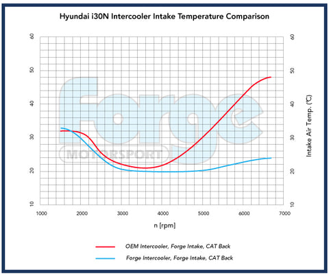 Tras más de seis pruebas en el dinamómetro, mantuvimos temperaturas de admisión de aire (IAT) muy seguras, y el intercooler de Forge Motorsport arrojó resultados de 24 °C, reduciendo a la mitad la temperatura de admisión del intercooler de fábrica, que era de 48 °C. Estas pruebas se realizaron en condiciones relativamente frías, con una temperatura ambiente en la celda del dinamómetro de 15 °C, lo que demuestra la ineficiencia del intercooler de serie. Durante los meses de verano, el intercooler de serie, junto con temperaturas de admisión de aire más elevadas, tendrá un impacto muy negativo en el rendimiento del motor. En estas condiciones, el
